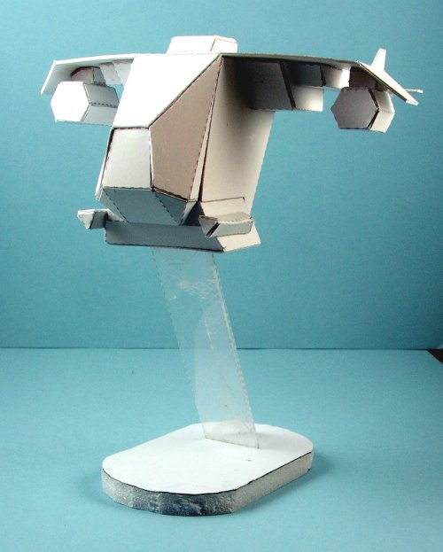 I did three test builds in paper to help refine the design and developed the clear mounting post from transparency to give the impression of flight. Below is a picture of the final design although I did move some of the fold tabs around to simplify building in the future, the builds pretty rough but I was in a little bit of a hurry :):