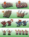 Next up was the Longbow men, they turned out looking a little robinhood-ish and I only did 3 different poses and limited the legs to left/right/center. Next was the Light infantry equipped with light chain mail and leather armour. Then I worked up some Light cavalry mounted on dinosaurs with the fox’s wielding short bows. At this point I went back and worked up standard bearers for the 4 troop types designed so far. I did a vertical and Horizontal Standard bearer for each troop type, except the cavalry which got horizontal banners only.