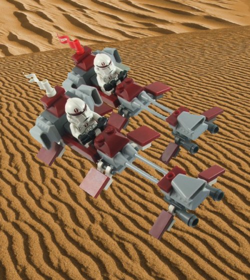 from the pictures you can see the minifig has some protection along the side rear and front, although I’m not sure id want to ride one into battle it’s  a significant improvement over the stock lego version.  I played around in GIMP for 5mins a pulled the below together, racing across the deserts of Tatooine into battle or possibly some other desert world: