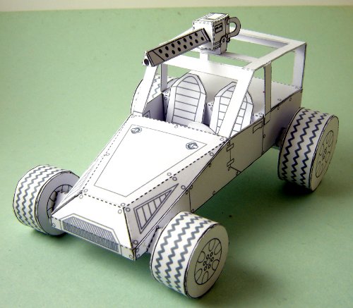 Under Defiance or pretty much any generic Sci-fi wargamming rules I needed a more diverse range of vechiles than just a tank and troopers. I checked over what Jim had planned for the future of Terra-force and no dunebuggy was listed as a potential build (no point in doubling up). I had also been thinking about designing a paper dunebuggy for a long time but hadn’t been able to come up with any viable way to attach the wheels to an angled chassis.