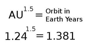 This bit is fairly glossed over, if you want to get into the full workings and understanding feel free to check out Keplers Laws, for me I’m happy with the below. Basically grab your AU distance for your first planet and place it to the power 3/2, basically 1.5 and you’ll get the orbit of your planet in equivalent earth years. An example My primary planet Etena is 1.24 AU from the Star Ravi, 1.24 to the power of 1.5 equals 1.381 earth years or 504 earth days: