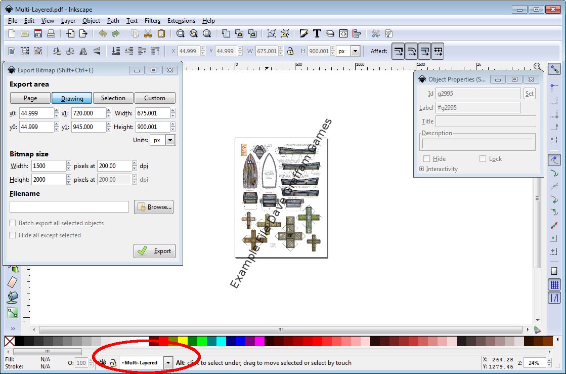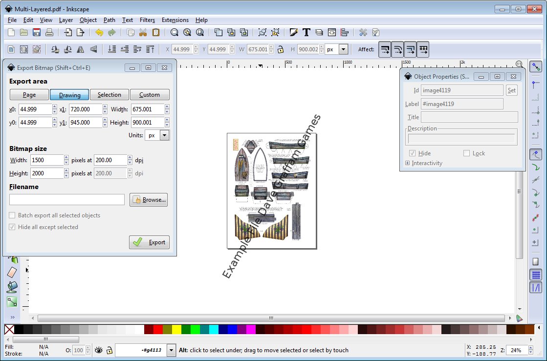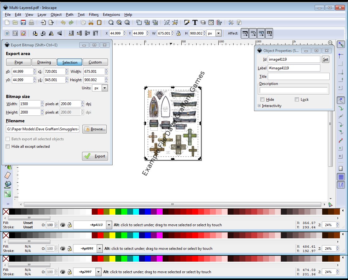 You have now captured all the individual layers that make up the PDF. There is no need to save the inkscape file as you have the original PDF and really we didn’t add much value in inkscape but you can save it if you like. To unhide all the objects before saving it’s Object>>Unhide All. Now read on to GIMP Reassembly