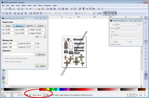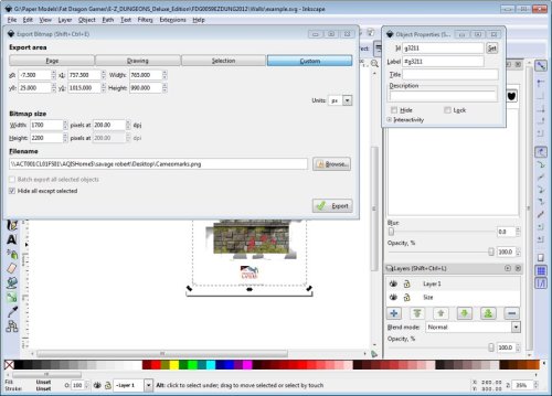 You have just exported your first layer. Now onto the remaining 5 to 5000 this is fairly quick although repetitive. You can leave the export window sitting open. Open the object properties window Object>>Object Properties or Shift-Ctrl-O on the little window that opens tick Hide. Again leave this open. Next click on the middle of your images and the next object down will be selected. Simply Click on your export Window and name the png to something else and then hit export: