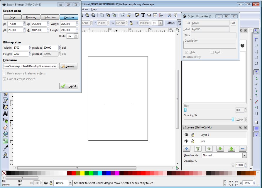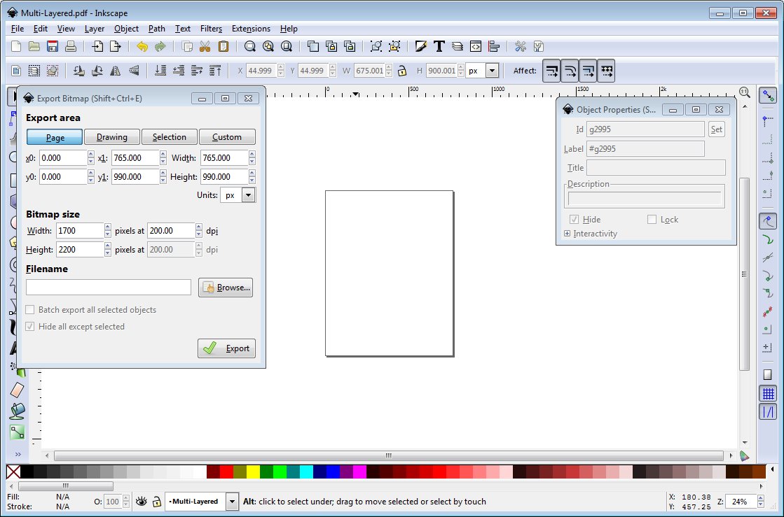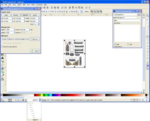 Okay first up open your Export Dialogue (File>>Export Bitmap or use Shift-Ctrl-E) and Object Windows (Object>>Object Properties or Shift-Ctrl-O). Put these out of the way so you can see the image in the middle.