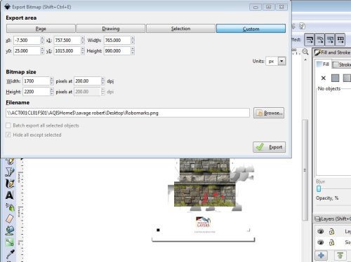 Now to start Exporting either go to File>>Export Bitmap or use Shift-Ctrl-E and the export dialogue will open. Select Custom along the top, then change x0, y0, width and height values to those you noted above. Select the browse button and select a location to save the image file to and the name. The name isn’t critical and if you don’t know what is on the layer selected simply call it “one” and the next “two” etc or some other logical naming pattern you prefer. Lastly tick on “Hide all except selected” and press “Export”: