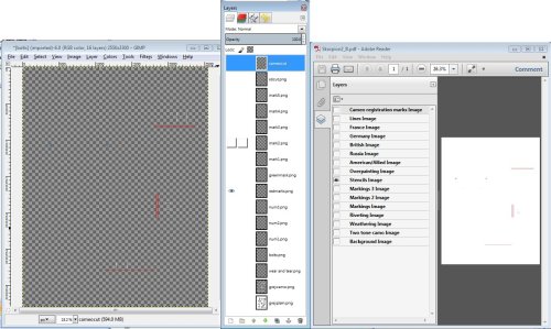 This next step is slightly easier if you are using dual monitors. Next open the original PDF in Adobe Reader and then open all your extracted layers in GIMP using File>>Open as Layers and make your way to your extracted image folder and then select all the extracted images and select open. You should now have something vaguely resembling this: