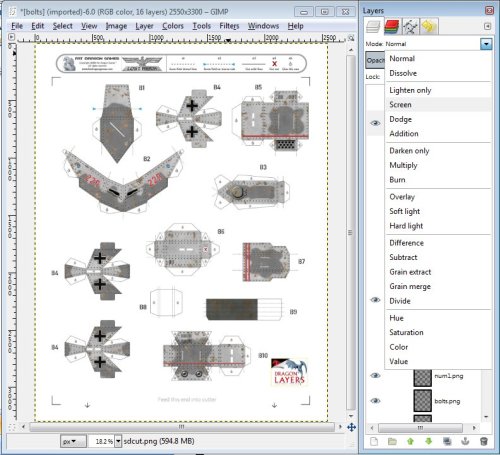 Unfortunately I can’t guide you to which one exactly to use but some good ones to try are “Overlay”, “Darken Only”, “Burn”, “Screen”, “Hard light” and “Soft Light”. You’ll need to try different layer modes until you either get lucky and get an exact match or close enough that your happy with the result. I have found with some of Dave’s models my best results have been achieved by turning a layer off completely, my best guess is this is due to slight incompatibilities between the software Dave uses (Photoshop) to generate the files and GIMP.