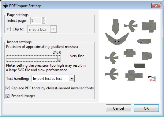 For me this screen is sometimes very slow to load and refresh so be patient with it and assume every click is registering. If you used a multiple Page PDF set the Page number to the page your interested in, in my case it’s only a single page so it is locked to page 1, move the “Precision of approximating gradient meshes” to very fine 246.0 and leave all other settings as they are and select “OK” – this can take some time and your computer may seem to lockup but give it chance to work and it should eventually return a result: