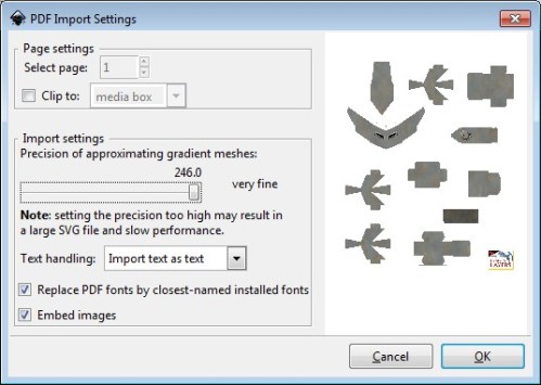 Launch Inkscape so it is open and ready to go, then go to File>>Open and select the PDF your interested in converting. You will be presented with this screen: