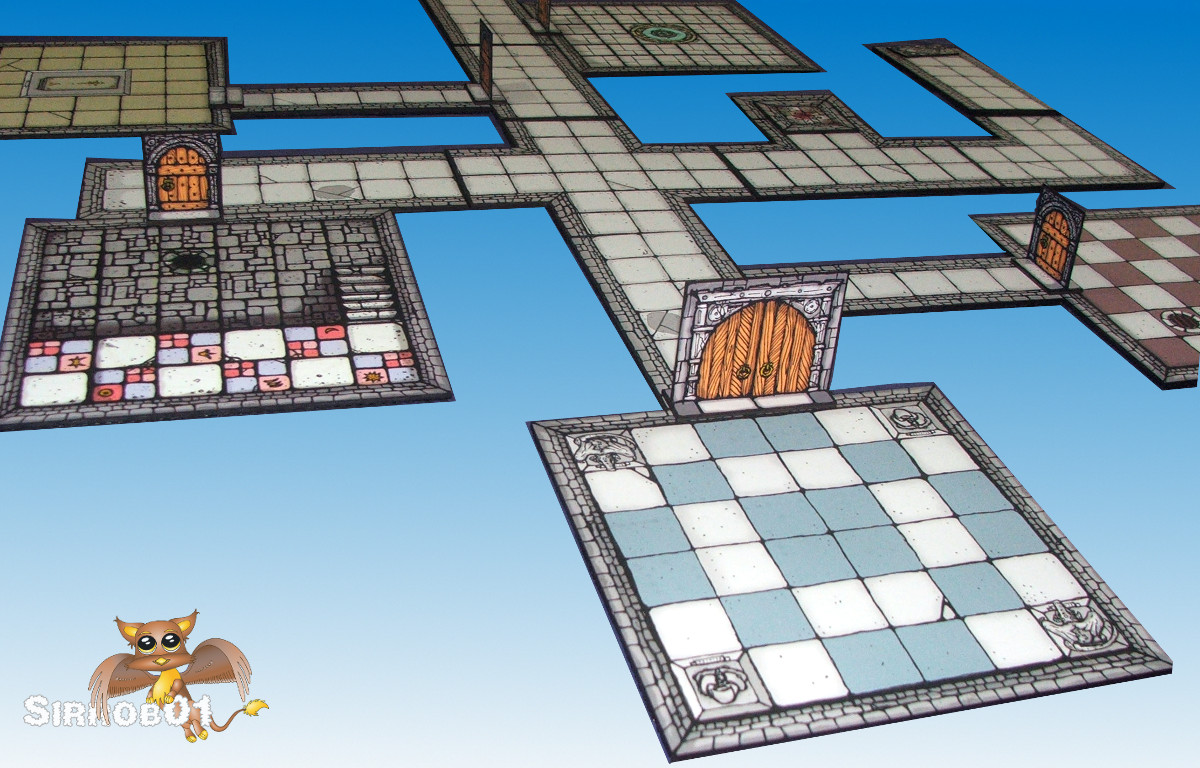 The rooms I created from the parts supplied by Billiam although I did a fair chunk of altering in Gimp to make them fit a 6×6 square. Other than the room with blue squares you could replicate most of the room designs with a pair of scissors, glue and  a little ingenuity or simply use the ones that come with the bundle (12 rooms included).